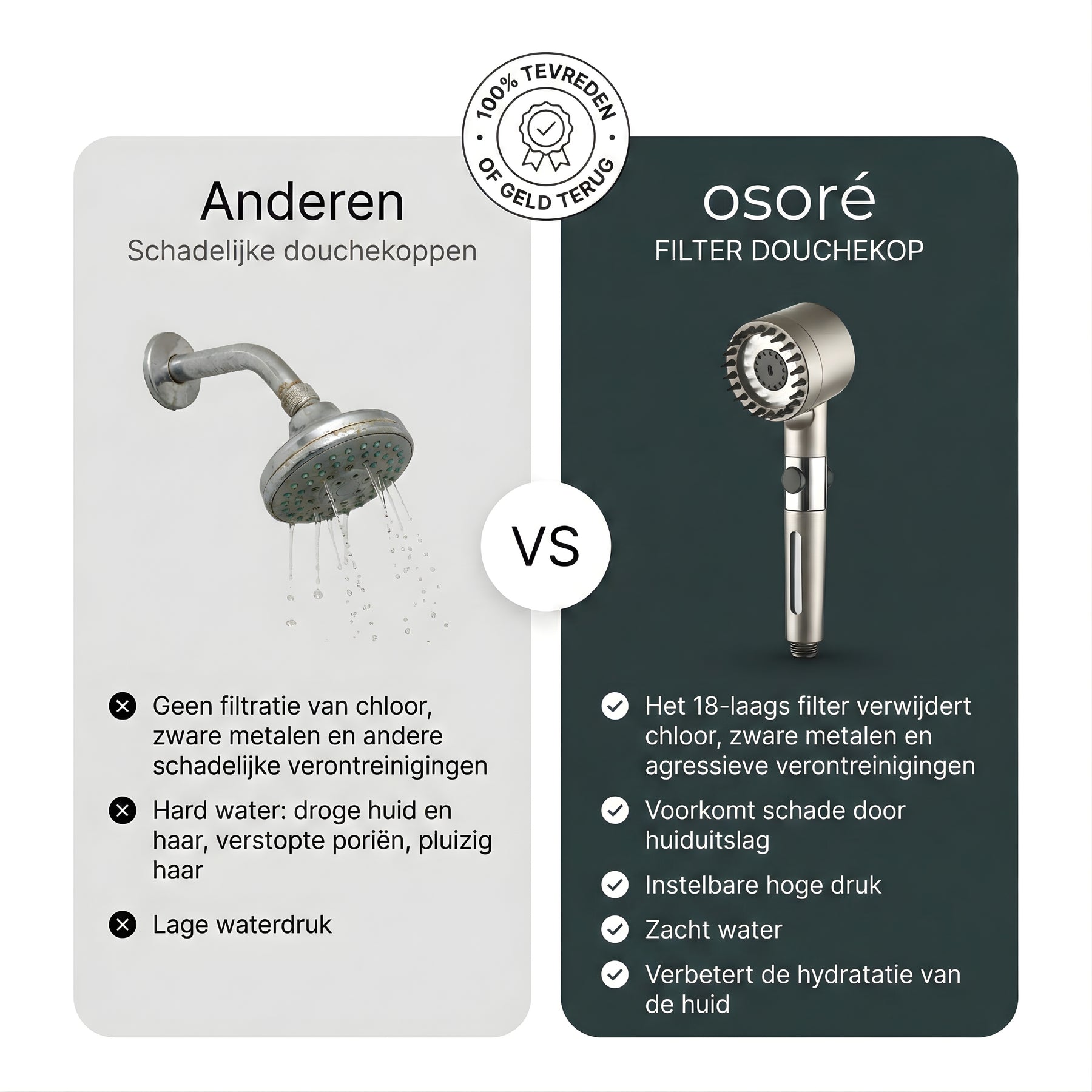 Spa-achtige druk: duizenden masserende waterdruppels spoelen twee keer zo snel en reinigen uw huid en haar grondig. 18-traps filtersysteem: verwijdert 99,9% van chloor, roest en zware metalen, waardoor uw huid en haar worden beschermd tegen onzuiverheden.